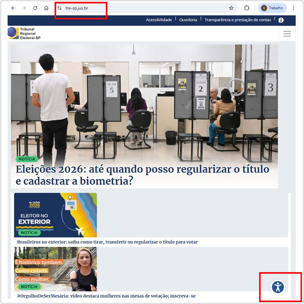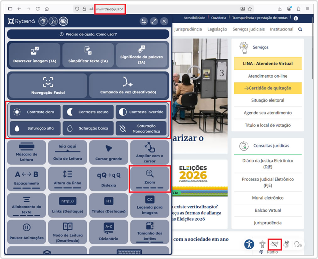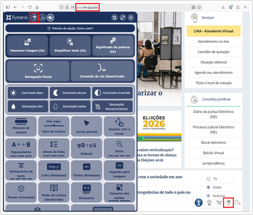 A ferramenta Rybená pode ser acessada clicando no ícone de acessibilidade, localizado no canto inferior direito do portal do TRE-SP (www.tre-sp.jus.br). Para utilizá-la, basta seguir as orientações demonstradas nas capturas de tela abaixo: