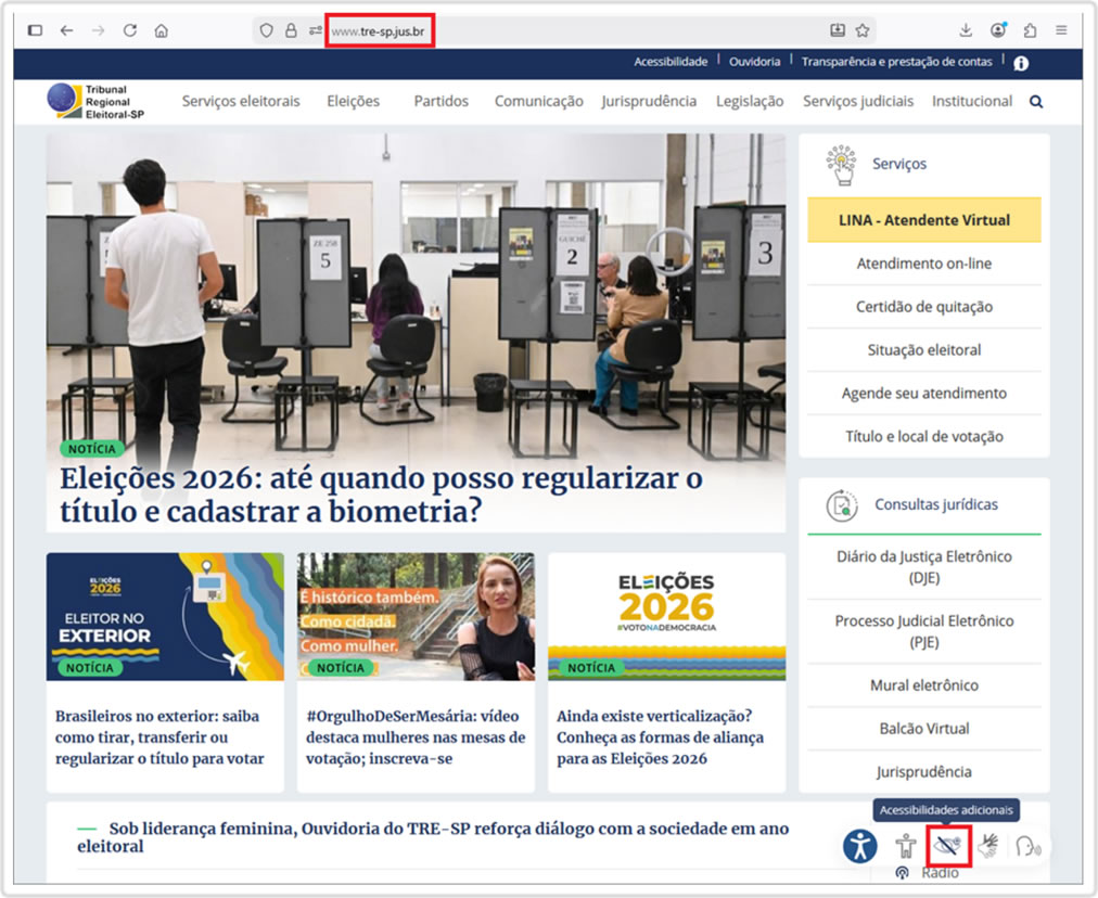 Ao selecionar o terceiro ícone, o menu expande para as Acessibilidades Adicionais, conforme demonstrado na imagem abaixo: