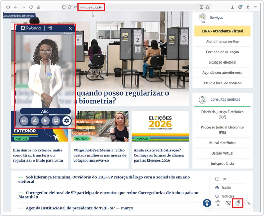 Além disso, ao acionar o quarto ícone, o usuário conta com o suporte da Alici. Ela é a intérprete virtual que traduz instantaneamente as informações do site para a Língua Brasileira de Sinais (Libras).
