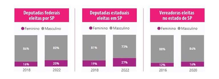 Já no Legislativo estadual paulista, o incremento é ainda maior: em 2018, as deputadas estaduais eleitas representavam 19% do total da Assembleia Legislativa e, em 2022, esse percentual chegou a 27%.